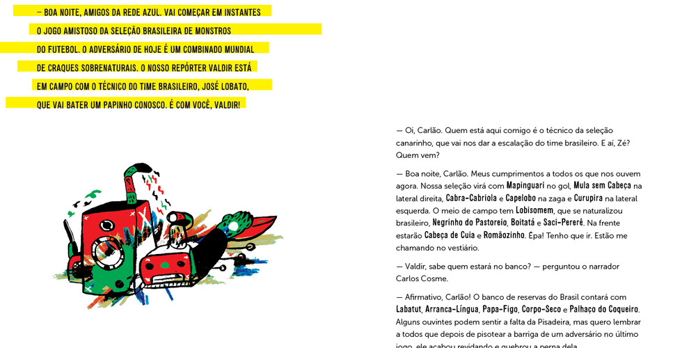 A seleção canarinho deste livro tem uma escalação bem diferente de todas que você já viu: a Mula sem cabeça, o Boitatá, o Negrinho do Pastoreio, o Saci e outros craques do nosso folclore, selecionados pelo técnico José Lobato (será?). No campo do adversário brasileiro, está um time de feras do mundo inteiro: Frankenstein, Pé Grande, a Múmia, o Ciclope, o Abominável Homem das Neves e outros monstros que povoam o nosso imaginário e que você nem imaginava que eram bons de bola. E essa partida muito doida é toda narrada por um locutor de futebol de rádio, com repórter em campo e tudo! Se fosse apostar num bolão, qual dos dois times você chutaria que vai ganhar?